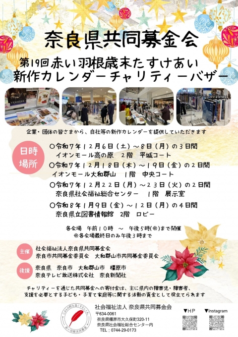 奈良県共同募金会では、12月1日から実施される歳末たすけあい運動の一環として、今年度も、企業・団体等からカレンダーを提供いただき、地域住民の皆さまにチャリティーにご協力いただく「第19回赤い羽根歳末たすけあい新作カレンダーチャリティーバザー」を県内4か所で開催します。