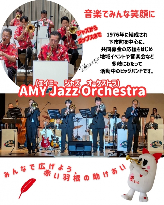下市町を中心に、共同募金の応援をはじめ、地域イベントや音楽会などで多岐にわたって活動中のビッグバンド『AMY Jazz Orchestra (エイミー・ジャズ・オーケストラ)』さん、子どもたちによるキッズパフォーマンスやジャンケン大会、キャラクターとの写真撮影会などがあります。