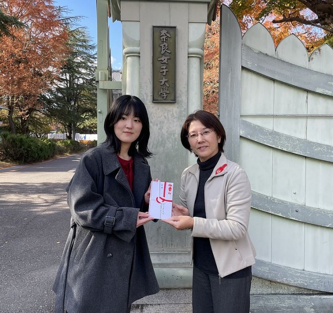 奈良女子大学恋都祭実行委員会様が、10月31日(金)から11月2日(日)まで開催された「第74回恋都祭」において、チャリティーイベント「チャリティーくじ」を実施され、令和7年12月5日(金)、その収益80,000円を共同募金にご寄付いただきました。