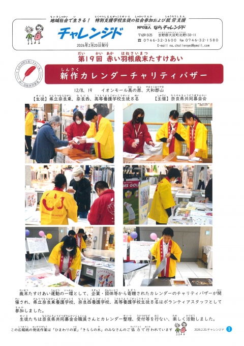 NPO法人 ならチャレンジド(理事長 赤川 義之様)が共同募金の助成を受け、年に3回発行している広報紙で、特別支援学校の生徒・卒業生によるさまざまな社会参加活動や職場実習等の様子が写真とともに紹介されています。